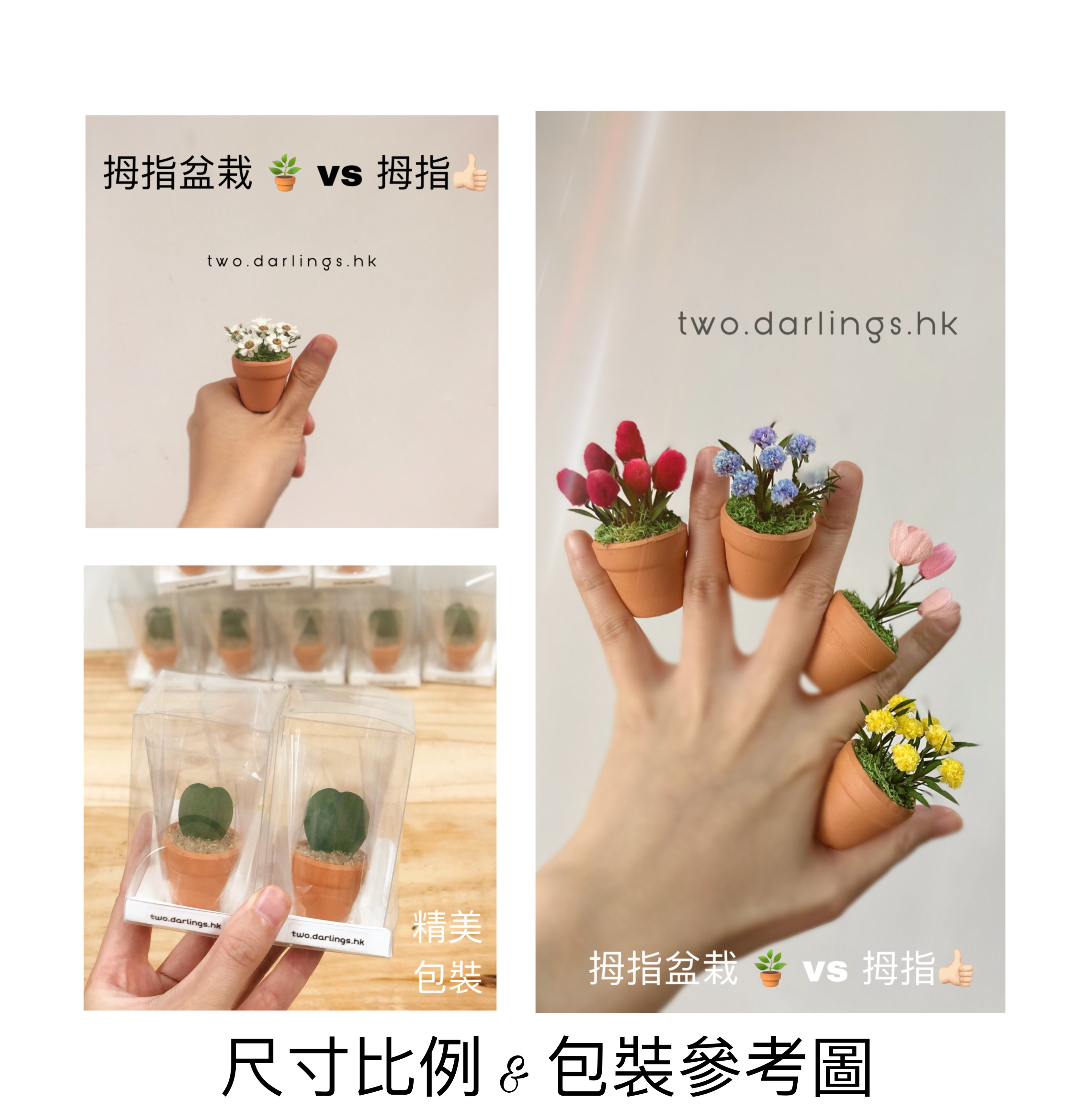拇指盆栽特色: 採用真的植物,經特別技術保存,可以達到免打理,免照料。拇指👍🏻尺寸,迷你又可愛,每盆花製作時間為30-45mins,心機之作。 | 🪴拇指盆栽乃店主個人喜好創作,不涉及任何花語,除非特別註明,否則沒有特別意思,請不要深究。有時候會為個別作品特別命名。 | 🪴創作靈感來自店主喜歡的花花草草,希望帶給大家一種接近大自然,欣賞植物的片刻。